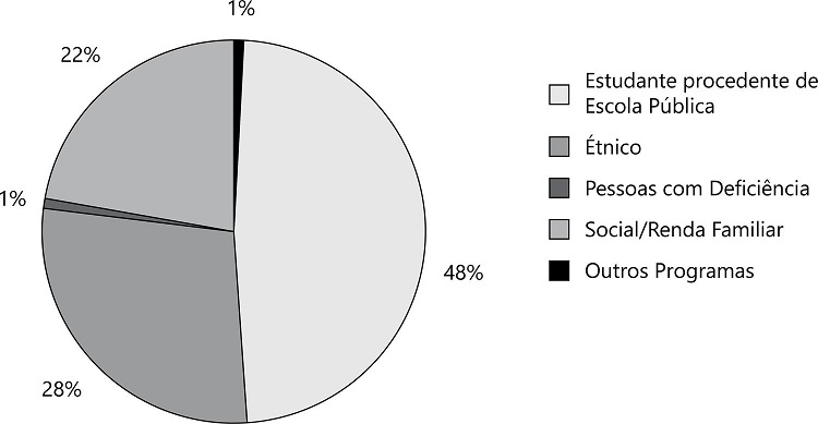 O Gráfico 1 mostra que, do universo de 727.460 alunos dos ingressantes no Ensino Superior pelo programa de reserva de vagas, 48% correspondem à categoria estudante procedente de escola pública; 28%, à categoria étnico; 22%, social/renda familiar; 1%, pessoas com deficiência; e 1%, outros programas (não enquadrados nas demais categorias segundo o Censo).