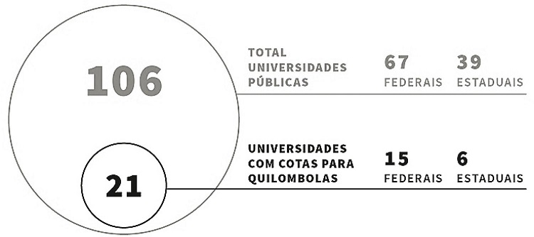 Os dados evidenciam que de 106 universidades públicas, sendo 67 federais e 39 estaduais, somente 21 dispõem cotas para o ingresso de estudantes quilombolas, o que compreende apenas 20%. Assinala-se que este estudo não apresentou informações sobre universidades municipais.