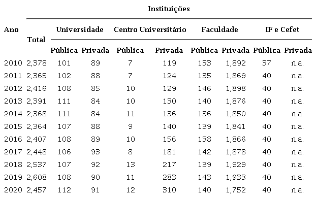 É possível notar ainda a grande lacuna da oferta de cotas específicas para estudantes quilombolas, quando observamos o número de instituições de Educação Superior públicas e privadas existentes, sendo um total de 2.457 no ano de 2020, entre universidades, centros universitários, faculdade, Institutos Federais (IF) e Centros Federais de Educação Tecnológica (Cefet). Conforme se apresenta na Tabela 1, os dados do censo escolar 2010-2020 revelam o número de instituições de Educação superior públicas e privadas do Brasil.