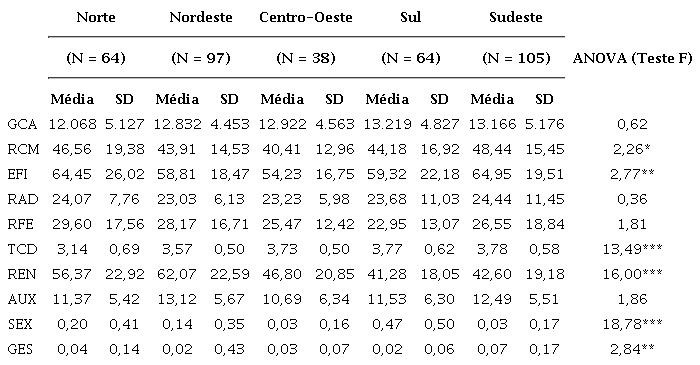 Com relação às variáveis acadêmicas, os dados revelam que as instituições possuem, em média, 23,75 RAD, resultado superior à meta mínima estabelecida no PNE. Os dados mostram também que as instituições têm, em média, 26,8% dos seus RFE. E, por fim, os dados evidenciam que a TCD é, em média, 3,61, o que sugere uma qualificação entre especialização e mestrado. Destas, apenas a TCD mostrou-se diferente estatisticamente, com menores índices na região Norte e Nordeste (p< 0,01), conforme exposto naTabela 2.