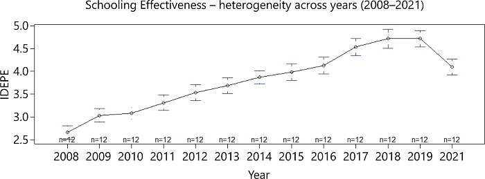 Secondly, we analyzed the trajectory of Schooling Effectiveness and Schooling Inequality using the Idepe and its standard deviation. Figure 1 shows the overall mean, and the lower and upper limits of Idepe, and Figure 2 shows the standard deviation of the Idepe, both for all 12 development regions, from 2008-2021.