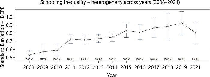 It is possible to infer that the equity of the result is more connected to the effects of the diversity of school typology (quite variable over the years), the location of schools (fixed over time), and the way that a region is developed (which also may be constant over time). These findings are comparable to Blanco and Ram (2019), in which the relationship has a regular-U shape.