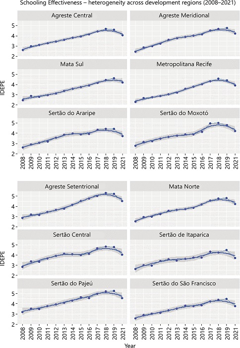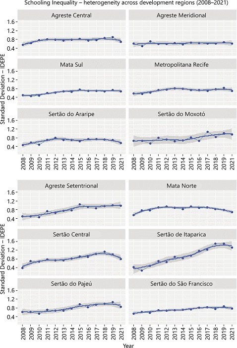 After this, we explored the trajectory of Schooling Effectiveness and Schooling Inequality within each development region across the years. Figure 3 shows multi panels with the mean of Idepe, and Figure 4 the standard deviation of the Idepe, both for each of the 12 development regions and respective trend lines, from 2008-2021.