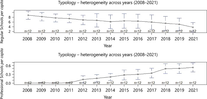 Figure 5 shows that typology varies across time, with the total of part-time schools (no extended journey) decreasing over the years, while the total of full-time technical schools has increased during the same period.
