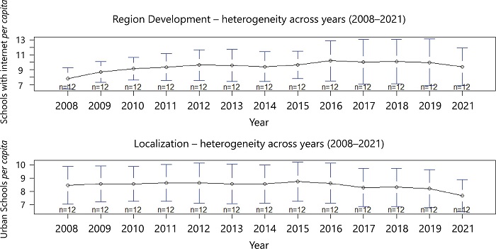 On the other hand, Figure 6 shows that the schools with internet and the urban schools are very stable over time. The first showed an increase and stabilized, while the second oscillated around a central value since the beginning of the period.