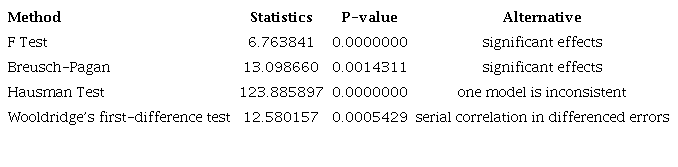 With the given equation, we build four model methods: (i) pooled, (ii) first differences - FD, (iii) fixed effects - FE, and (iv) random effects - RE, using R, RStudio, and the plm package (Croissant; Millo, 2008). We displayed the complete models in the appendix.