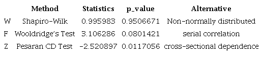 Upon identifying that Fixed Effects were adequate, we performed two procedures: i) reorganize variables searching for best fit; ii) follow up analysis to see if the model residuals were normal and if there was a serial correlation or cross-sectional dependence.