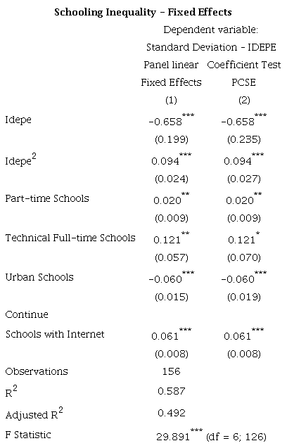 Since the Idepe is the used metric for Education effectiveness, we used the standard deviation of the Idepe as a proxy for schooling inequality, and the idepe and its quadratic term to test the linear and/or quadratic relation (positive or negative) between increasing effectiveness and expanding schooling inequality (Ram, 1990; Neves; Almeida, 2016).