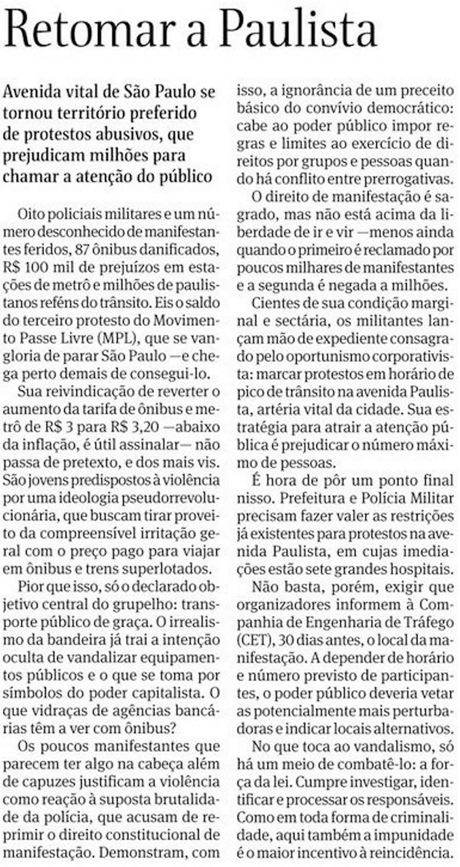 FOLHA DE SÃO PAULO. Retomar a Paulista. São Paulo, p. A2, 13/06/2013. Disponível em: < http://acervo.folha.com.br/>. Acessado em: 28 jan. 2016.