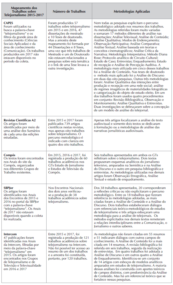 Inspirando-se no percurso metodológico proposto anteriormente (BECKER, 2015), foram coletados no mês de junho de 2018 os resumos publicados entre 2015 e 2017 de todas as Dissertações e Teses de Doutorado sobre telejornalismo catalogadas pela Coordenação de Aperfeiçoamento de Pessoal de Nível Superior, a CAPES5, dos artigos publicados nas sete revistas científicas brasileiras A2 da área de avaliação Comunicação e Informação, identificadas no Qualis Periódico disponível na plataforma Sucupira6, e de todos os trabalhos apresentados nos congressos7 da Associação Nacional dos Programas de Pós-Graduação em Comunicação (Compós), da Associação Nacional dos Pesquisadores em Jornalismo (SBPJor) e da Sociedade Brasileira de Estudos Interdisciplinares da Comunicação (Intercom)8. Posteriormente, foram realizadas a leitura dos resumos e a interpretação dos resultados.