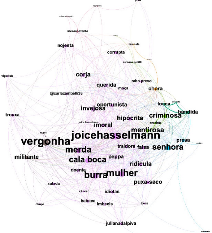 Entre os agrupamentos discursivos, vemos dois grandes grupos, um verde e um rosa. No grupo rosa, há um conjunto de deputadas presentes, com destaque para algumas, indicando que, proporcionalmente, essas mulheres recebem muito mais tweets com violência simbólica do que outras. A deputada Joice Hasselmann se destaca pelo número de tweets recebidos que a acusam de ter traído o então presidente, Jair Bolsonaro, de ser hipócrita e oportunista, e a colocam no centro de diversas polêmicas por seus posicionamentos. Neste sentido, a deputada parece ser alvo de críticas tanto de simpatizantes de outro espectro político quanto daqueles de seu próprio. Já as deputadas Carla Zambelli e Bia Kicis, por outro lado, recebem desqualificações principalmente de pessoas do espectro político oposto (esquerda).