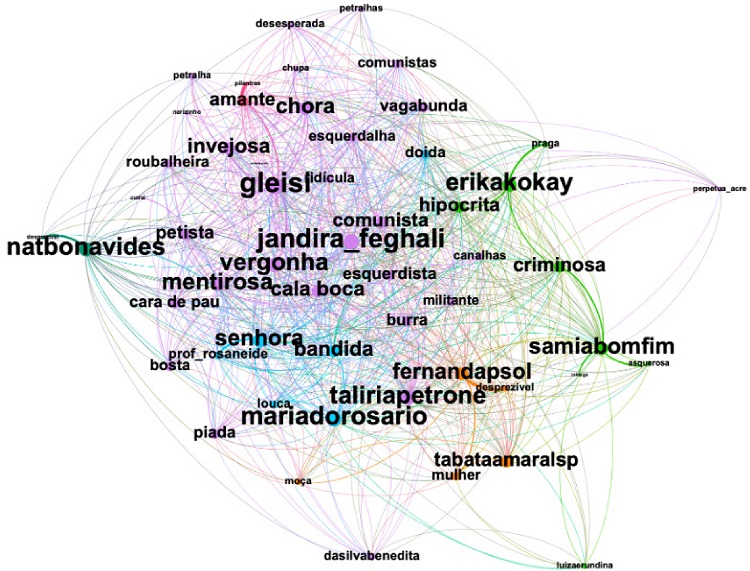 Quanto às redes analisadas, uma das narrativas centrais está na desqualificação da deputada Gleisi Hoffmann por ser amante do presidente Lula, numa crítica moral; e à deputada Jandira Feghalli por ser louca. De um modo geral, principalmente pelas fortes críticas alinhadas ao espectro político, a violência, neste caso, provinha principalmente de pessoas alinhadas com a direita.