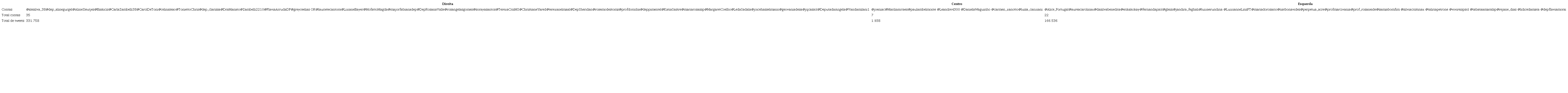 Para a análise, utilizamos a classificação do espectro político-partidário brasileiro de Bolognesi, Ribeiro e Codato (2021). Neste trabalho, os autores propõem uma distribuição dos partidos nos espectros de direita, esquerda e centro por meio de posicionamentos e ações políticas atualizadas. Essa classificação, assim, serviu de base para que as deputadas fossem agrupadas dentro de espectros políticos diferentes, de modo a auxiliar a análise das conversações. O quadro a seguir traz as contas das deputadas federais de acordo com o seu posicionamento político-partidário:
