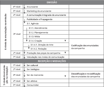 De acordo com essa definição, Barbosa e Trindade (2003) e Trindade (2005)2 propõem o modelo da enunciação publicitária (figura 1). Nele, são definidos seis níveis actanciais na emissão (do anunciante até a veiculação do anúncio) e cinco níveis actanciais na recepção. Actante pode ser concebido como “aquele que realiza ou que sofre o ato [...]; são os seres ou coisas que, a um título qualquer e de um modo qualquer [...] participam do processo” (Greimas e Courtés, 2011, p. 20). No modelo citado, os actantes são os agentes da enunciação publicitária.