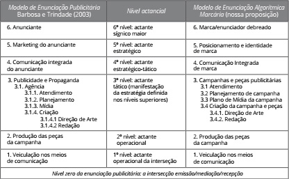 Passando ao modelo concebido por Barbosa e Trindade (2003) e Trindade (2005), estes exploram os conceitos da teoria da enunciação e os aplicam na prática da publicidade. Os autores definem a enunciação publicitária como atividade da comunicação cultural, cotidiana, hibridizada e sincrética, em que os agentes da enunciação interagem, por meio dos momentos e espaços onde o enunciado publicitário é criado, veiculado, recebido/consumido, (re)significado.