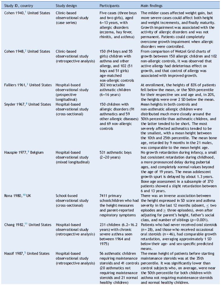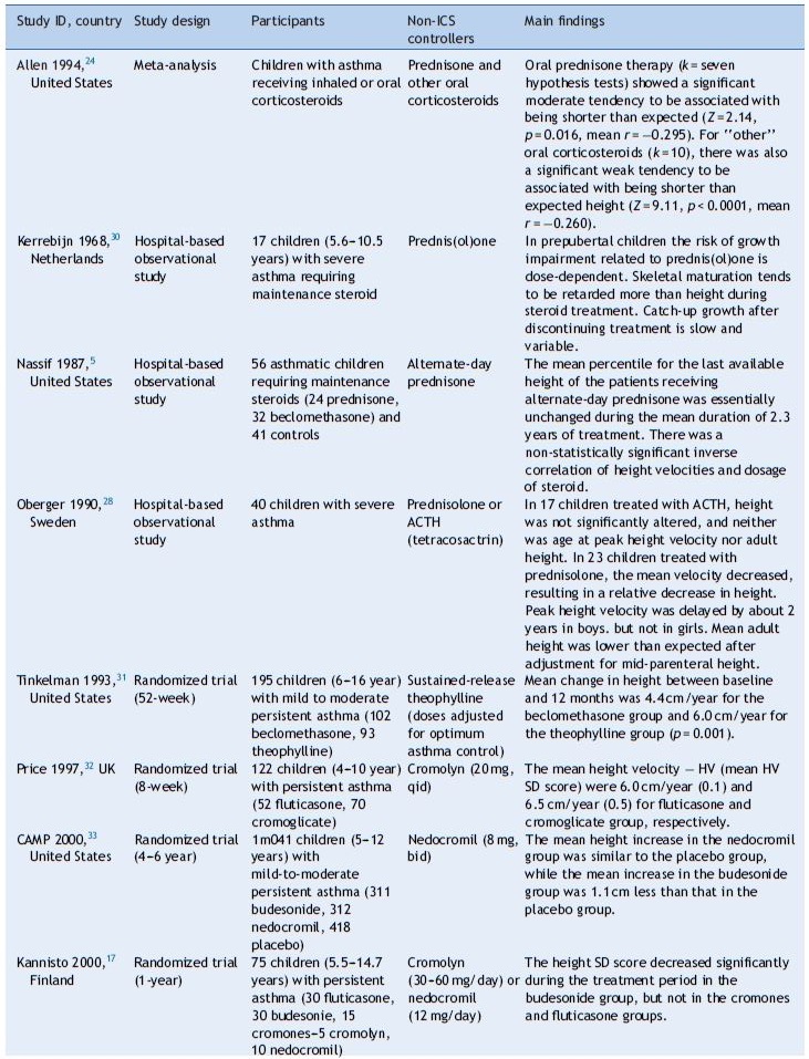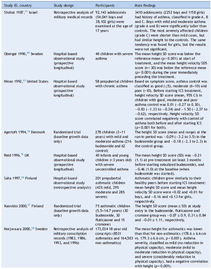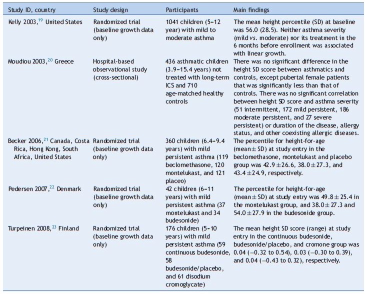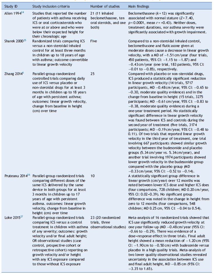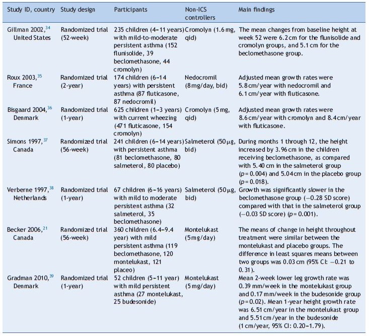Síntese dos dados: Trinta e sete artigos foram incluídos nesta revisão. Os achados de 21 estudos sugerem que a asma por si só, especialmente os casos mais graves e/ou descontrolados, podem prejudicar o crescimento da criança. Duas revisões Cochrane de ensaios clínicos randomizados mostraram uma pequena redução média no crescimento linear (−0,91 cm/ano para beclometasona, −0,59 cm/ano para budesonida e −0,39 cm/ano para fluticasona) no primeiro ano de tratamento com corticosteroides inalados em crianças pré-púberes com asma persistente. Os efeitos pareciam ter efeito dose- e molécula-dependente. Uma revisão recente mostrou que a maioria dos estudos observacionais da "vida real" não encontrou efeitos significativos dos corticosteroides inalados no crescimento de crianças asmáticas. Quinze estudos mostraram que a manutenção de corticosteroides sistêmicos poderia causar uma supressão do crescimento dose-dependente em crianças com asma grave, mas outros controladores (cromonas, montelucaste, salmeterol e teofilina) não tiveram efeitos adversos significativos no crescimento.