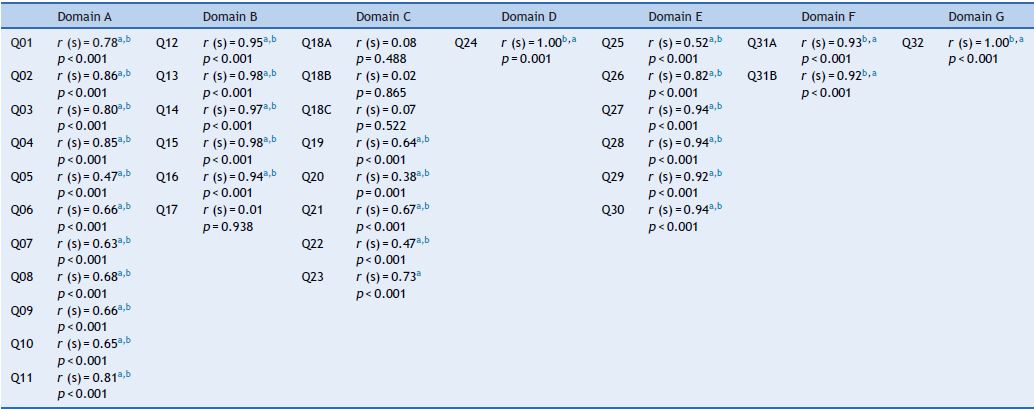 Most correlations between items and domains were significant. Questions about pets and electronic devices that were on during the interview were not significant with their domains (Table 2). The Cronbach's alpha of the questionnaire was 0.92 (95% CI: 0.89 -0.95). Cronbach's alpha values greater than 0.8 were found in almost all domains, except in the C domain (Cα - 0.39 (95% CI: 0.16 -0.58). Cronbach's alpha values in the domains A, B, D, E, F, and G were, respectively: A - Cα 0.96 (95% CI: 0.87 -0.93); B - Cα 0.93 (95% CI: 0.91 -0.95); D - Cα 0.92 (95% CI: 0.89 -0.95); E - Cα 0.92 (95% CI: 0.89 -0.95); F - Cα 0.83 (95% CI: 0.79 -0.86), and in the G domain - Cα 0.92 (95% CI: 0.86 -0.95). After excluding each one of the items, the Cronbach's alpha value was higher than 0.9. The intraclass correlation among the evaluators was 0.97 (95% CI: 0.96 -0.98). When split-half correlations were analyzed, they showed r: 0.60, with p < 0.001.