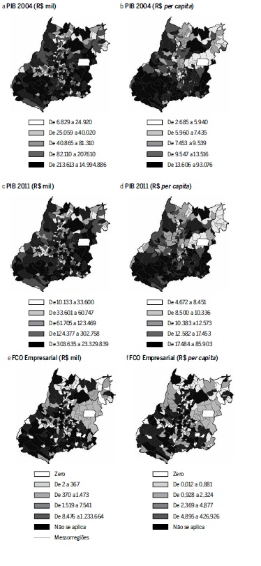 Fonte: Relatórios gerenciais emitidos pelo Banco do Brasil e Ministério da Integração Nacional5.O mapa das atividades de indústria e serviços do Estado de Goiás é apresentado a seguir por meio do PIB municipal. Essa separação foi feita por conta da classificação dos programas (Empresarial e Rural), que está ligada diretamente com a distribuição de atividades econômicas. A relação entre o montante do FCO destinado para cada município e o seu nível de produção (PIB) é positiva. Isso está de acordo com a maioria dos resultados encontrados em outros estudos, os quais indicaram que a distribuição do fundo esteve relacionada à demanda de financiamentos . Assim, ao analisar as figuras a seguir se percebe a existência de correlação do montante financiado com o PIB municipal e, consequentemente, com a localização das firmas avaliadas. Dessa forma, algumas linhas do FCO acabam indo em maior peso para os municípios que possuem determinado nível de atividade econômica.