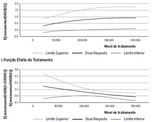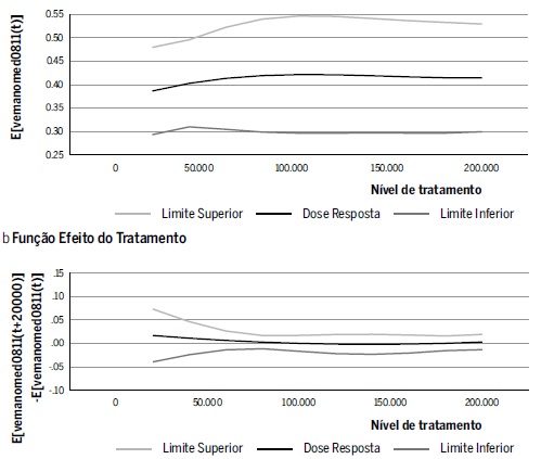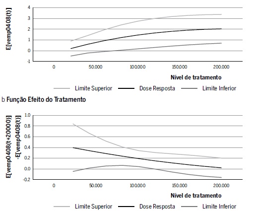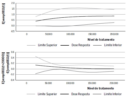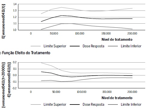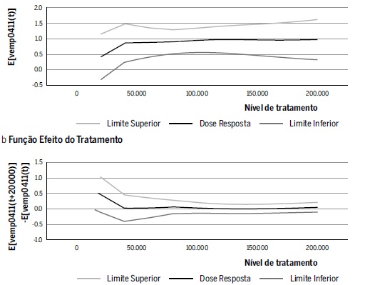Cada nível de tratamento T∼ informa um resultado potencial médio Ê[Y(T∼)]. A avaliação de vários níveis de tratamento permite descrever a função dose-resposta. Em seguida, pode-se estimar o efeito de um incremento marginal (ε > 0) no empréstimo sobre o crescimento do emprego e do salário, variáveis de interesse. Assim, esse efeito é dado por: