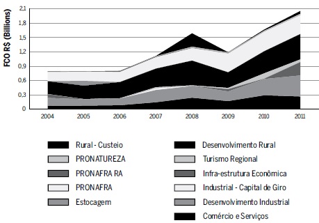 As linhas de financiamento do FCO se distribuem conforme as atividades econômicas, isto é, o Programa Empresarial está ligado ao setor industrial e de serviços e comércio, e o Programa Rural se relaciona com a agropecuária nas linhas rurais e do Programa Nacional de Fortalecimento da Agricultura Familiar (Pronaf). O gráfico 1 mostra o valor das contratações por linha de financiamento e ressalta os programas Rural e Empresarial. No período foram analisadas quase 30 mil contratações do Programa Empresarial, com valor médio de R$ 136 mil, sendo que foram realizados no total, aproximadamente, mil financiamentos, em 2004, com um valor médio de R$ 200 mil (valores correntes), saltando para mais de 8 mil contratos, em 2011, com um valor médio de R$ 125 mil.