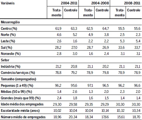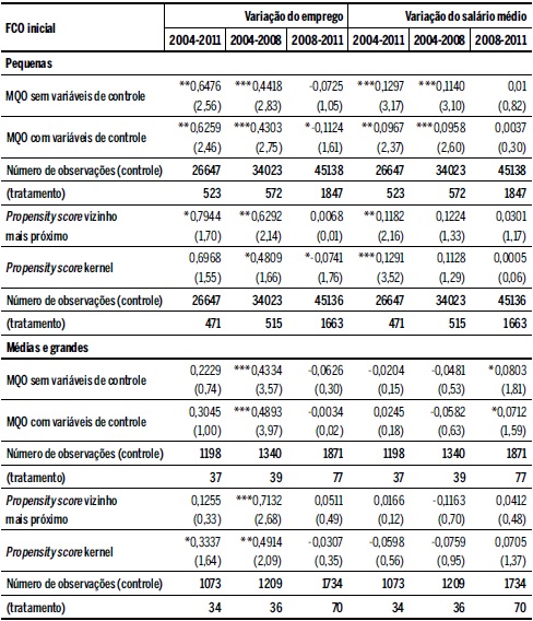 Em relação às variáveis de resultado, menos de 5% das empresas teve queda dos salários médios e o primeiro quartil perdeu empregos entre 2004 e 2011. De maneira geral, a situação foi melhor para as empresas que tomaram FCO, as quais perderam menos empregos e tiveram maior incremento de trabalhadores e salários médios. Neste sentido, algumas empresas apresentaram crescimento de empregos e salários superiores a vinte vezes, nos períodos analisados. Estes casos, isto é, outliers, foram excluídos da amostra e representaram menos de 1% das empresas - ao se realizar uma análise descritiva destas, percebe-se que foram exatamente as firmas pequenas que melhoraram substancialmente de situação.