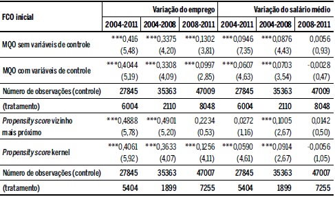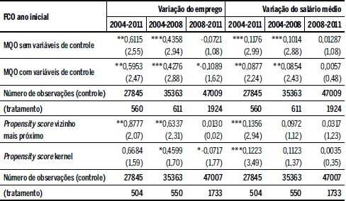 Após o pareamento pelo vizinho mais próximo, as empresas que usaram o FCO em qualquer um dos anos entre 2004 e 2011 incrementaram em média 102,3% o número de empregos. Já as firmas que não tomaram, aumentaram 53,4% os empregos gerados. Apesar de estes valores não constarem na tabela acima, sua diferença, revela o impacto de 48,8p.p. sobre o incremento no número de empregos. Para essa variável, o pareamento por kernel leva a resultados mais parecidos com os verificados pelas regressões de MQO, em torno de 40p.p. Em ambos os casos, o valor é estatisticamente significativo e alto.