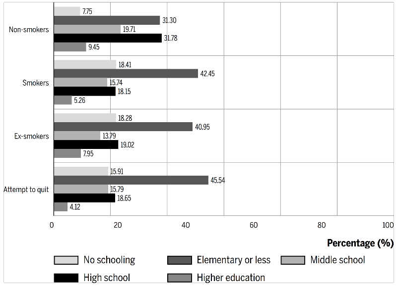 For variables related to education levels, using no schooling as a benchmark we found evidence that the higher the level of education, the lower the probability of smoking and the lower the daily cigarette consumption. Thus, a negative relationship between education and smoking behavior was observed.