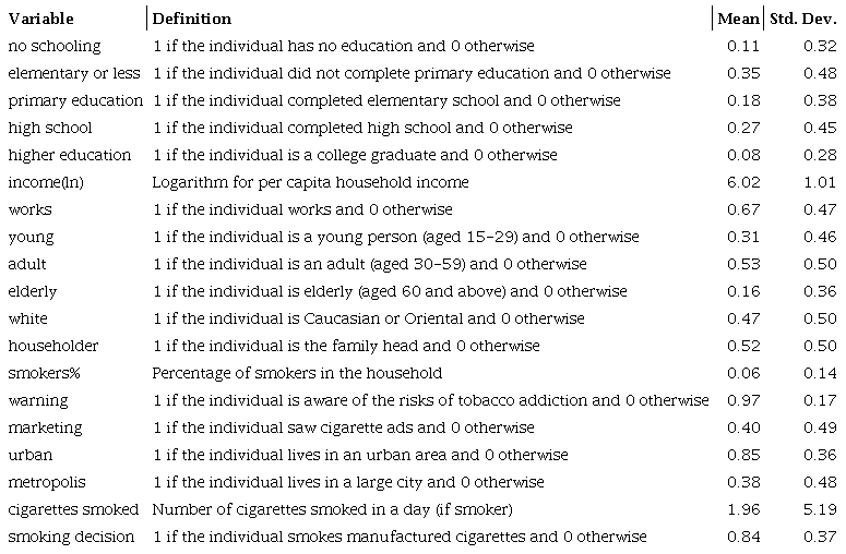 Table 1 shows the variables used for modeling the decision to smoke and daily cigarette consumption intensity. The specifications of our empirical models were based on a theoretical framework and, mainly, on previous studies, which will be discussed in Section 3