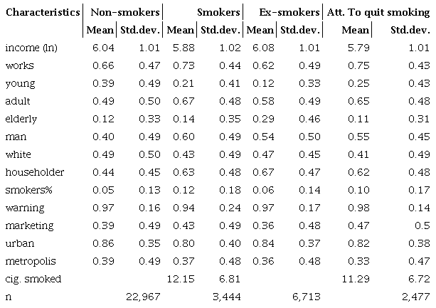 The percentage of smokers is also higher in the group of workers (73%) and heads of family (63%), suggesting that working may be a proxy for a stressful life, as pointed out in Kouvonen et al. (2005). Regarding household characteristics, we can see that, on average, a smokers’ household tends to have a higher number of smokers. This reveals an externality of smoking habits that affects other members of the household. A study by Health and Social Care Information Centre (2018) showed that young people living with smoking adults in the same household are more likely to start smoking.