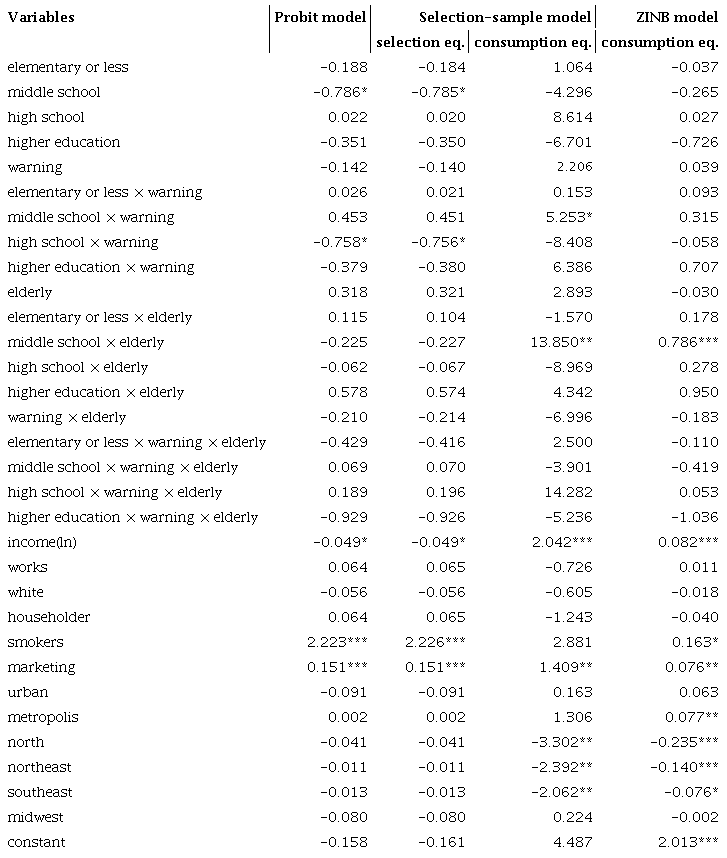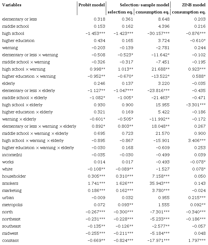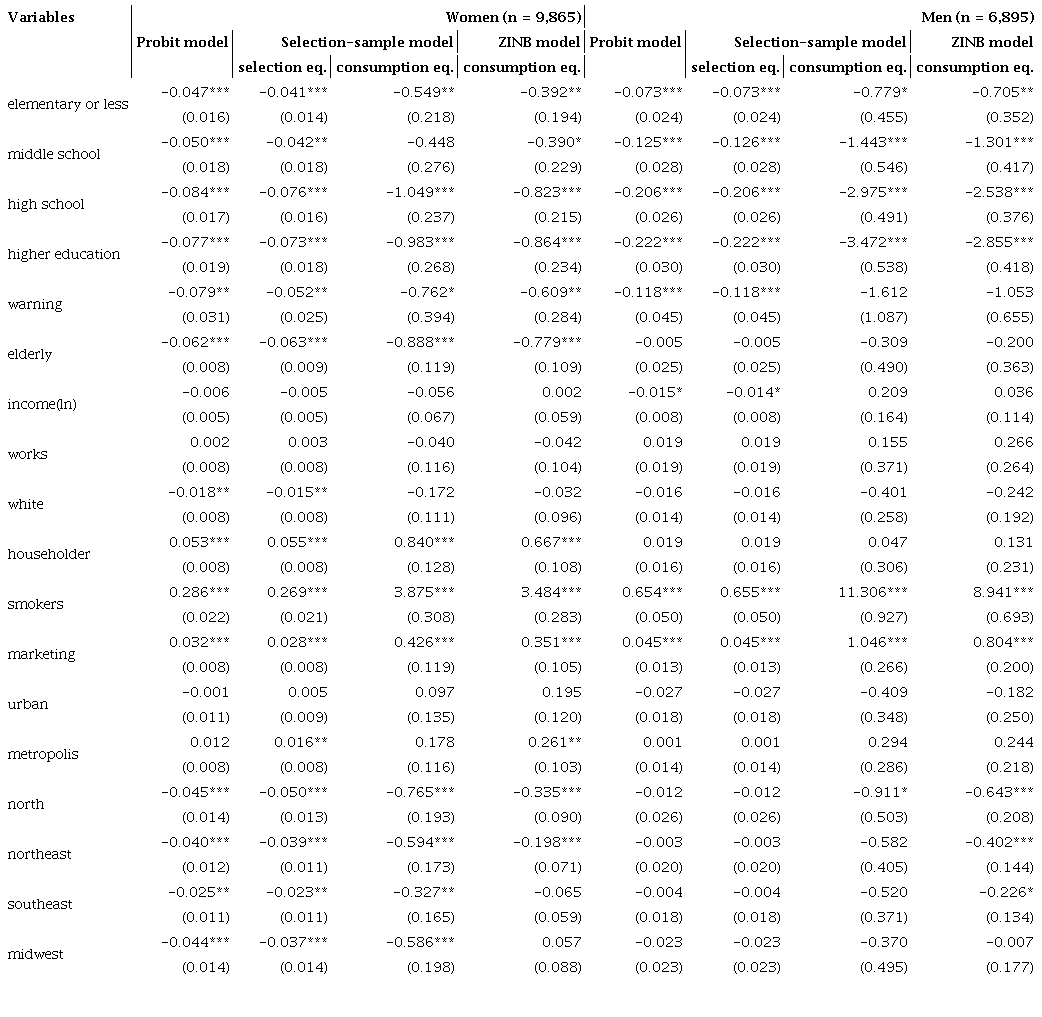 In short, the usual probit model and the first step of the sample-selection models (which is also a probit model) were used for modeling the decision to smoke; and the second stage of the sample selection and the count part of the ZINB models were used for the daily consumption intensity. These models were estimated using the sample expansion factors associated to each observation.