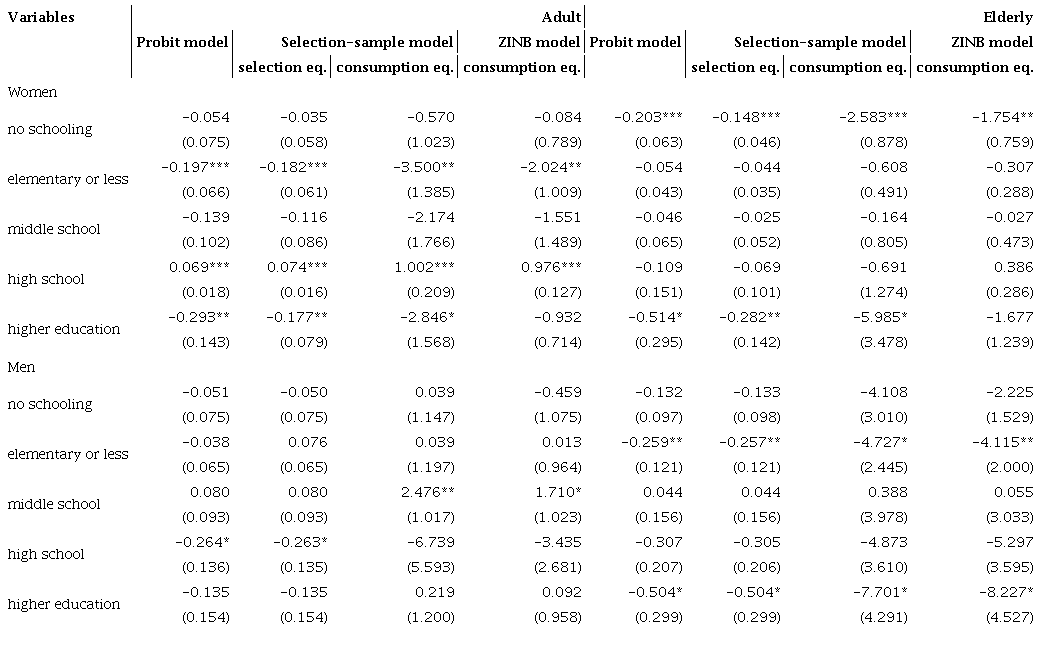 The results suggest that the probability of women smoking is about 0.1 percentage points (p.p.) lower for more educated individuals (variable: higher education) as compared to unschooled individuals. Moreover, among women smokers, highly educated women consume about 1 cigarette less a day than those unschooled. For more educated men, we found a reduction of about 0.2 p.p. in the probability of smoking and a decrease of three cigarettes in the daily average consumption as compared to the benchmark.