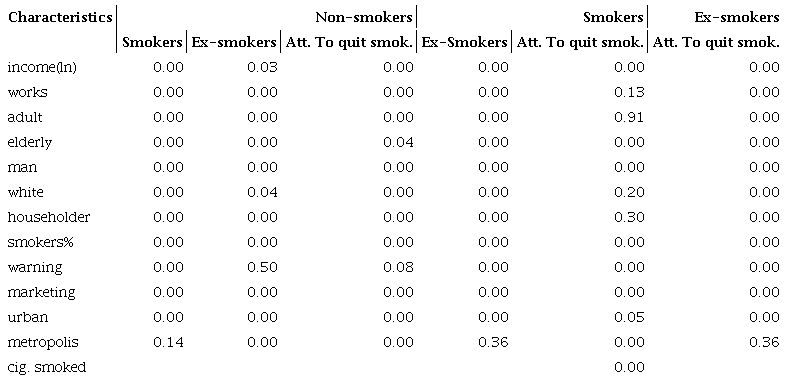 Lastly, Table A.1 also indicates that the difference between smokers and those who attempted to quit smoking is not so clear. But we can at least infer that there is a difference in non-observable characteristics, i.e. those who made an attempt to quit smoking may have more discipline and willpower (Almeida and Araujo Júnior, 2017). The same argument is plausible for explaining differences observed between smokers and ex-smokers.