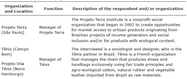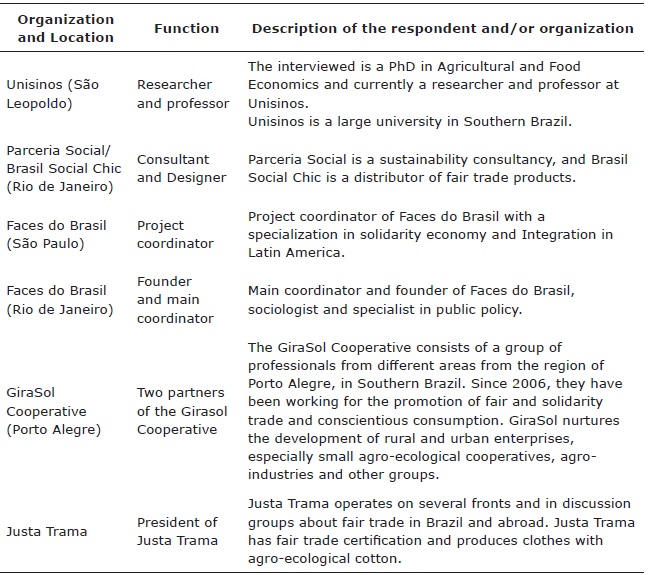 Since our aim was to further understand the current scenario, as well as to delineate motivations and perspective for the internal market, we searched for experts on the subject, as well as fair trade practitioners in terms of product commercialization. Initially, we interviewed an academic expert on fair trade (PhD in Agricultural and Food Economics by University of Reading, UK), a consultant and designer in social projects and the project coordinator of Faces do Brasil. Additionally, we also included representatives of organizations that base their operations on fair trade principles, such as Girasol Cooperative in Porto Alegre, the Projeto Terra in São Paulo and two certified organizations, Justa Trama and Tênis.