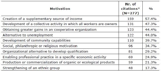 The four reasons most cited by respondents for establishing their organizations are related to economic issues (see Table 2). Economic reasons come from the possibility of creating supplementary sources of incomes (57.4%), obtaining higher gains (44.4%), search for alternatives to unemployment (44.0%) and the development of a collective activity where all workers are owners (47.3%). Social reasons for creating the organizations were also cited by the respondents. The most reported reasons were the development of community capabilities (39.7%), social, philanthropic or religious motivations (34.7%) and the production of organic or green products (21.3%).
