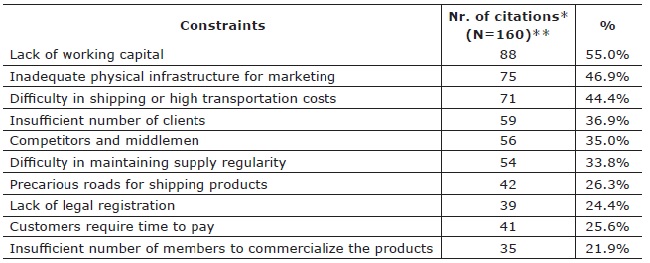 One objective of the study was to analyze what were the difficulties that Brazilian organizations linked to fair trade networks faced to produce and sell their products. Among the surveyed organizations, 68.7% reported facing difficulties surviving in the market. Several problems were mentioned, such as the lack of working capital (cited by 55% of the organizations), inadequate physical infrastructure for marketing (46.9%) and difficulty in shipping (44.4%). The previously reported lack of legal registration is a problem for 24.4% of the organizations. Without formal contracts, they are not able to provide invoices and to operate in certain markets. Table 4 shows the percentage of organizations that indicated each of the difficulties listed.