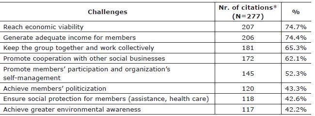 Despite these achievements, several challenges were cited by a high percentage of organizations (Table 5). Results show that a main challenge for most part of the organizations (74.7%) is reaching economic viability and generating adequate income for members. A slightly smaller percentage indicated the challenge of keeping the group together and working collectively (65.3%). Curiously, an even higher percentage of respondents indicated this item as an achievement. We infer that although many respondents noted group unity as an achievement, a union’s continuity over time is a challenging and very complex task. The same reasoning refers to the ability to generate adequate income for shareholders, which was cited as a challenge by 74.4% of respondents, although previously it had also been indicated as an achievement by 70.4% of them (see Table 5).