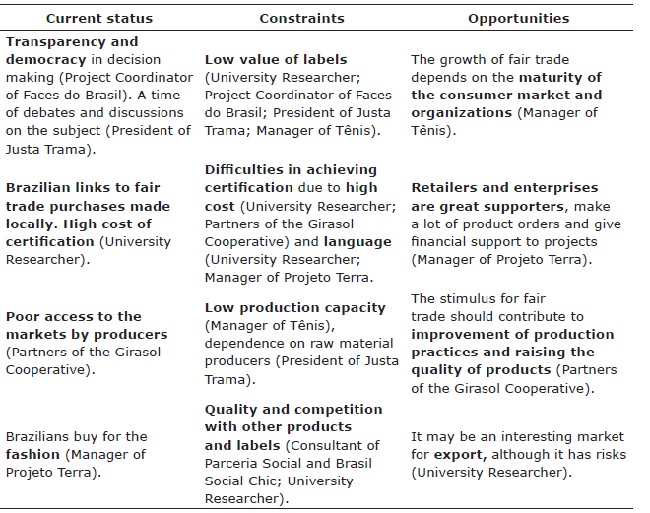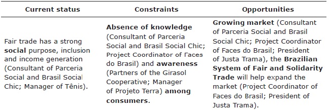 Table 6 presents the main ideas and opinions of the interviewees concerning the issues outlined above. There is optimism about the growth of this type of trade in Brazil, although some constraints remain to be overcome. It is necessary that fair trade become better known and that consumers know and understand the impact of its consumption and its importance in the economy.