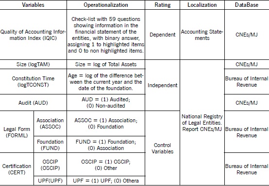 The data collection for this study occurred in two stages. The first one captured the variables used to characterize the institutions. The second collected the financial statements for measuring the quality index of financial information of the entities in the sample. Table 1 shows the variables used within their operation, classification, location and the database used.