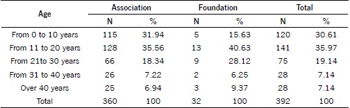 According to Table 3, most of the entities have the constitution time between 11 to 20 years, corresponding to 36% of the analyzed entities. The entities between 0 to 10 years show a percentage of 30.6% stake. This information is consistent with those data presented by the census conducted by IBGE (2012), according to FASFIL. The data show that 51% of the entities were created between the years 1991-2005.