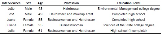 The interviews were conducted with three black businesswomen and two black businessmen, owners of beauty salons. In Table 1, we can see the profile of the interviewees. In order to preserve their identity, we chose to use fictitious names to represent them.