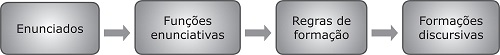 Com o agrupamento de enunciados, funções e regras, a formação discursiva surgiu como uma regularidade “entre objetos, tipos de enunciação, os conceitos, as escolhas temáticas” e a regra de formação revelou-se a condição a que esses elementos estão submetidos na rede discursiva (FOUCAULT, 2009a, p. 43). As etapas aqui apresentadas encontram-se ilustradas na Figura 1.