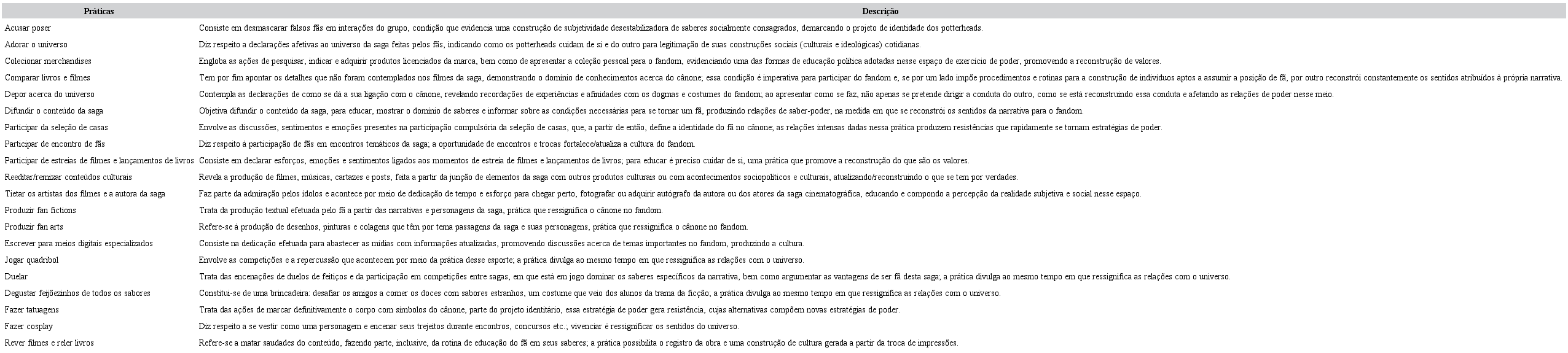 Nosso arquivo foi formado por práticas de potterheads, uma vez que, no mundo material, são essas práticas institucionais e sociais que cristalizam os discursos, possibilitando revelar o saber nesse espaço social (FOUCAULT, 2009a). Os potterheads são emblemáticos da categoria fã no contemporâneo e, sujeitos desta pesquisa, foram participantes indiretos, uma vez que os acessamos por meio de suas interações virtuais dadas no fandom. Identificamos no campo 20 práticas cotidianas dessa forma organizativa (Quadro 1). Estabelecemos, para a organização do arquivo, que a seleção de documentos fosse catalogada e organizada utilizando o critério das práticas de potterheads que identificamos como sendo suas ações habituais nesse fandom. Os documentos foram provenietes das seguintes mídias sociais: Facebook, YouTube, Twitter, Tumblr, Instagram, Snapchat, Ask.fm, Yahoo Answer, Share Question, Qzone, Whisper, blogs e websites. A seleção de práticas e de mídias foi estabelecida após uma sondagem com potterheads. No decorrer da pesquisa, mantivemos durante dois anos o contato semanal com dois potterheads, cujos encontros nos informavam acerca do universo e suas peculiaridades. Ao fim, nosso arquivo foi formado por 593 documentos, em português e inglês.