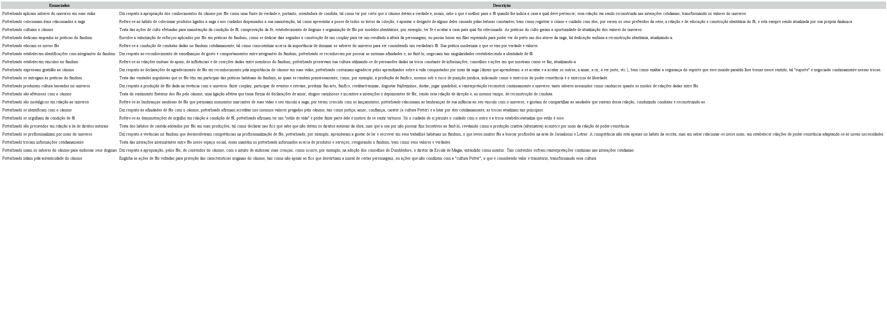 Para nominar as regras de formação utilizamos substantivos, seguindo a mesma lógica para objetos, conceitos e modalidades, e locuções substantivas para as estratégias. Identificamos dois objetos: conduta, que diz respeito ao modo de cuidar de si no interior da doutrina legitimada no fandom; e socialização, que se refere ao processo de interiorização das normas e valores da comunidade. Conceitos foram mais dois: condução. que diz respeito à forma de governar a si e aos outros no interior da doutrina legitimada no fandom; e legitimação, que trata da naturalização de normas e valores. Como pode ser observado, tratou-se de um conceito para cada objeto. Apesar disso, ambos se referem a mesma modalidade: moralidade, que indica um conjunto de princípios de conduta coletivamente aceitos. Esse ethos, por sua vez, fica expresso em duas estratégias, em linha com os objetos e conceitos: código moral, que demonstra o estabelecimento de um conjunto de regras orientadoras da conduta da comunidade; e solidariedade política, que indica a assunção de um compromisso moral entre seus integrantes.