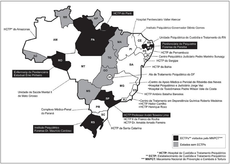 Em 2011, sob demanda do Departamento Penitenciário Nacional, foi realizado o primeiro censo no país para mapear os estabelecimentos e as pessoas que recebiam tratamento psiquiátrico obrigatório em cumprimento de uma medida de segurança (DINIZ, 2013). Pôde-se, então, conhecer o número de Estabelecimentos de Custódia e Tratamento Psiquiátrico (ECTP) existentes, bem como a sua localização e demais características. De acordo com essa contagem, existe um total de 26 ECTPs, sendo 23 HCTPs e 3 Alas de Tratamento Psiquiátrico (ATP) (DINIZ, 2013).