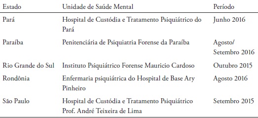 Dos 22 relatórios divulgados pelo MNPCT, apenas cinco se referiam a visitas realizadas em HCTPs ou em ATPs. As unidades de saúde mental visitadas pelo MNPCT correspondem a 19,2% daquelas existentes no país (Figura 1) e estão localizadas nos estados do Pará, Paraíba, Rio Grande do Sul, Rondônia e São Paulo (Tabela 1).