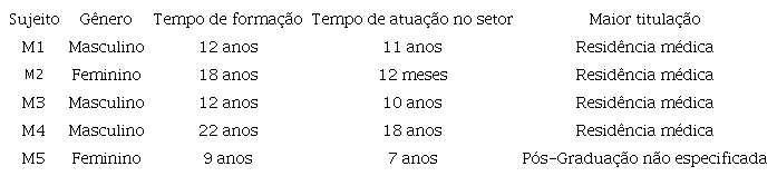 Conforme a tabela 1, o grupo de participantes foi composto por três profissionais do gênero masculino e dois do feminino. Em relação ao tempo de formação, a média foi de 14 anos, variando entre nove e 22 anos; quanto ao tempo na atual função - plantonista no setor do hospital - a maioria se encontrava entre 10 e 12 anos. Verificou-se ainda que, para a maioria, a titulação mais elevada foi a residência médica, sendo três especialistas em cirurgia do trato digestivo.