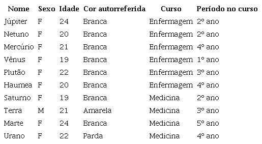 As/os 10 estudantes receberam uma identificação por nome de planetas para garantir a privacidade individual. Cada participante está apresentado na Tabela 1. Da amostra, nove estudantes eram mulheres e apenas um era do sexo masculino. A idade variou de 19 a 24 anos, sendo que seis eram estudantes do curso de graduação em Enfermagem e quatro do curso de graduação em Medicina. Houve grande diversidade entre os anos do curso na amostra. A maioria dos estudantes (n=8) se considerava branca em relação à raça/cor.