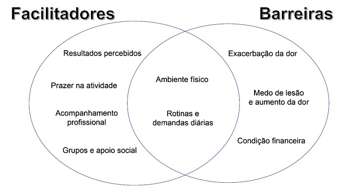 Results: The facilitators were perceived results, professional monitoring, pleasure in physical activity and exercise groups as social support. As barriers: exacerbation of pain, fear of injury or worsening of symptoms and financial resources. The physical environment and the daily demands and routines fit into both - barriers and facilitators.