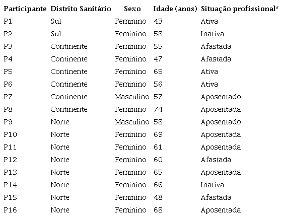 O estudo contou com 16 participantes, predominantemente mulheres, com idade entre 43 e 74 anos, pertencentes aos Distritos Sanitários: Norte (n=8), Sul (n=2) e Continente (n=6). As características sociodemográficas de cada participante estão descritas na Tabela 1.