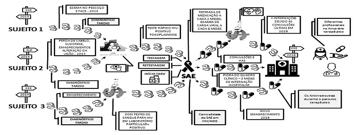 Sintetizando, o estudo evidenciou que o itinerário terapêutico dos idosos se iniciou com diagnóstico tardio e que eles procuraram os serviços de saúde (principalmente UBS) devido ao surgimento de sintomas físicos relacionados ao HIV/Aids. O espaço central para o tratamento do HIV/Aids foi o serviço especializado, no qual foram realizadas as consultas, testes laboratoriais e retirada de medicação. A terapia antirretroviral foi iniciada logo após diagnóstico e primeiros exames de carga viral e CD4, e foi utilizada durante todo o percurso, apresentando poucos efeitos colaterais; os profissionais de maior contato foram a enfermeira, a farmacêutica e o médico infectologista.